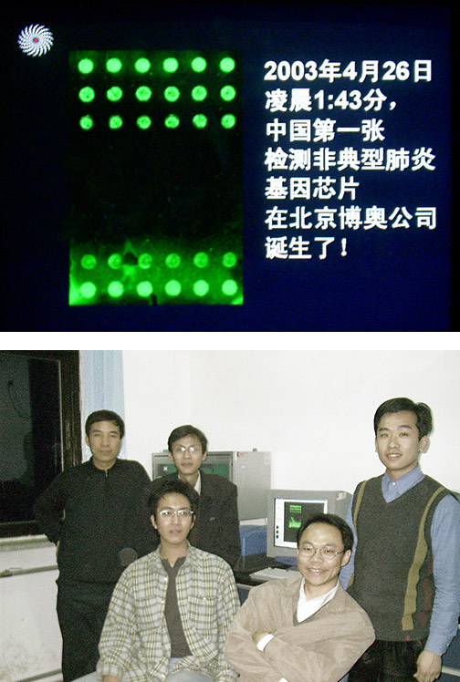 2003年4月26日,博奧生物SARS項目組與解放軍302醫(yī)院、中國疾病預(yù)防控制中心病毒預(yù)防控制所和清華大學(xué)第一附屬醫(yī)院精誠合作,刻苦攻關(guān),于凌晨1點43分,研制成功全球首張專門用于SARS病毒檢測的基因芯片,實現(xiàn)了對“非典”病人臨床樣本的檢測和確認。臨床驗證和排查工作的結(jié)果表明,SARS病毒檢測基因芯片在技術(shù)方法的嚴謹性、發(fā)病早期檢測、檢測準確率和靈敏度等方面均有明顯優(yōu)勢,為SARS病毒的快速早期臨床診斷提供了可靠高效的方法和途徑。