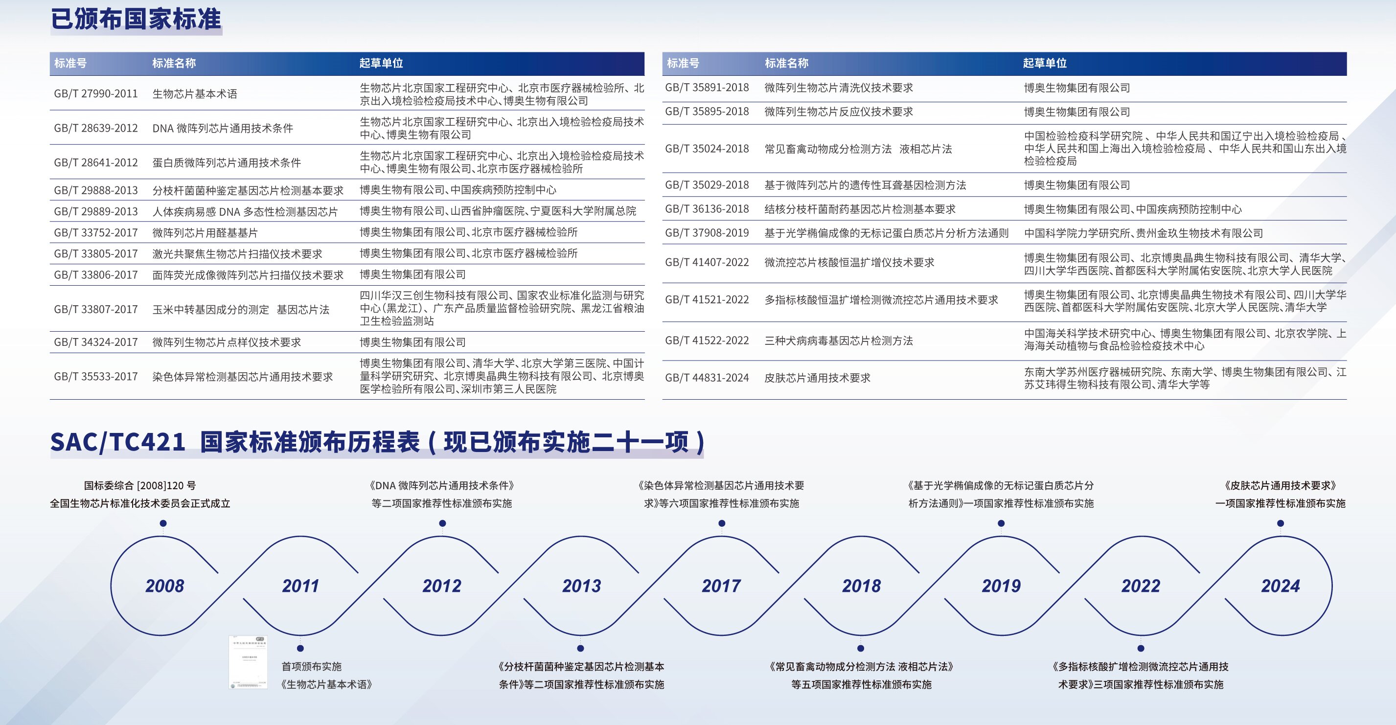 全國生物芯片標準化技術委員會(TC421)經國務院標準化主管部門批準設立。博奧生物作為TC421的主任委員和秘書處承擔單位,全面負責生物芯片的基礎、相關產品及檢測方法等范圍的國家標準制修訂工作。