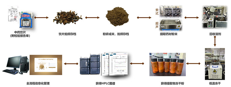 物質庫平臺承擔研發用中藥飲片的采購、粉碎、提取和儲存,原料出入庫管理,中藥指紋圖譜分析等工作。根據當前項目對中藥研發的需求,建立了(1)基于2020版《中國藥典》的616味中藥提取物庫;(2)包括藏藥、維藥、傣藥在內的多個民族藥提取物庫。此外,平臺利用HPLC技術構建中藥指紋圖譜,助力藥材質量管理及成分檢測。結合中藥現代化、信息化管理需求,和大數據與人工智能研究院共同開發中藥高通量篩選實驗室信息管理系統,實現對藥物采購、出入庫、提取、儲存、質控全流程的數字化可溯源管理。物質庫平臺極大地提高了中藥研究的準確性和可重復性,為藥理藥效研究提供了全方位的支持。